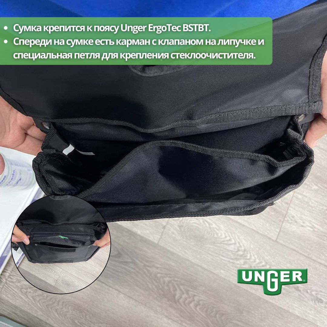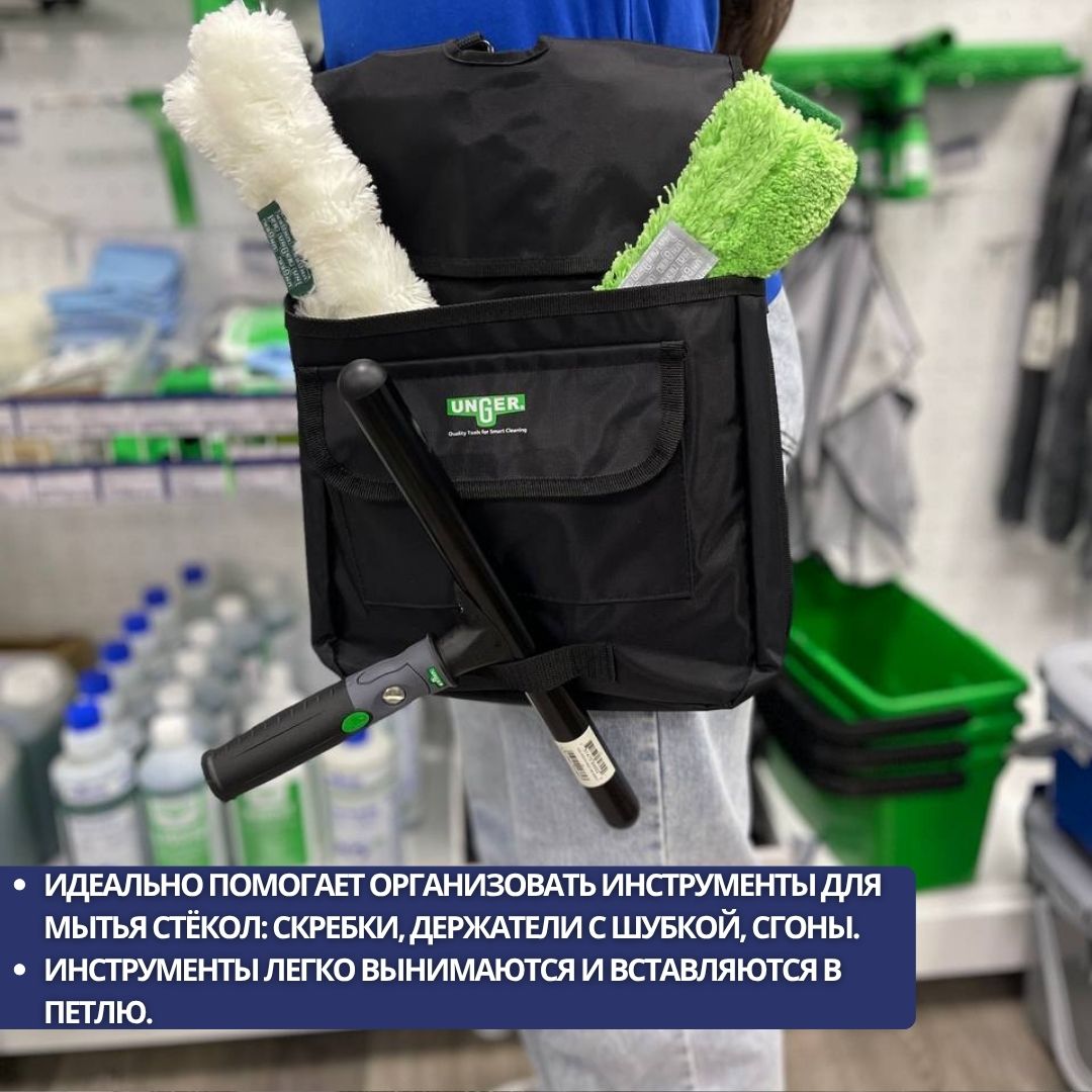 Спереди на сумке есть карман с клапаном на липучке и специальная петля для крепления скребка для чистки стекол.